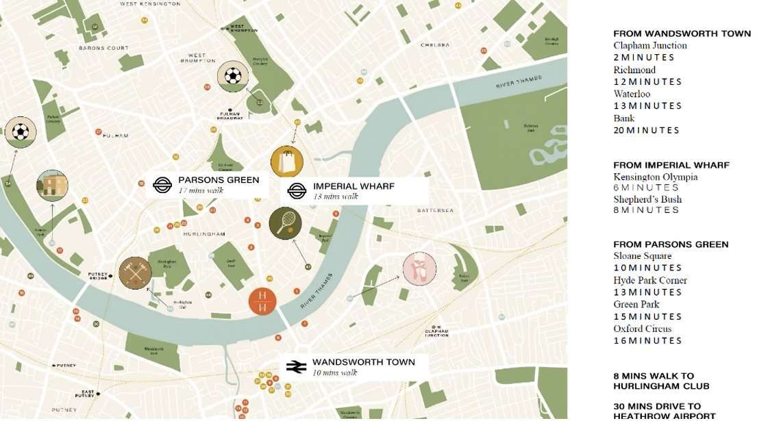 Hurlingham Waterfront临近火车站和地铁站,步行约10分钟即达Wandsworth Town火车站,步行约13分钟即达Imperial Wharf地铁站,步行约17分钟即达Parsons Green地铁站,轻松连接伦敦西区、金融城和其他区域。坐地铁一站直达Clapham Junction站,驾车约30分钟即达希思罗机场。