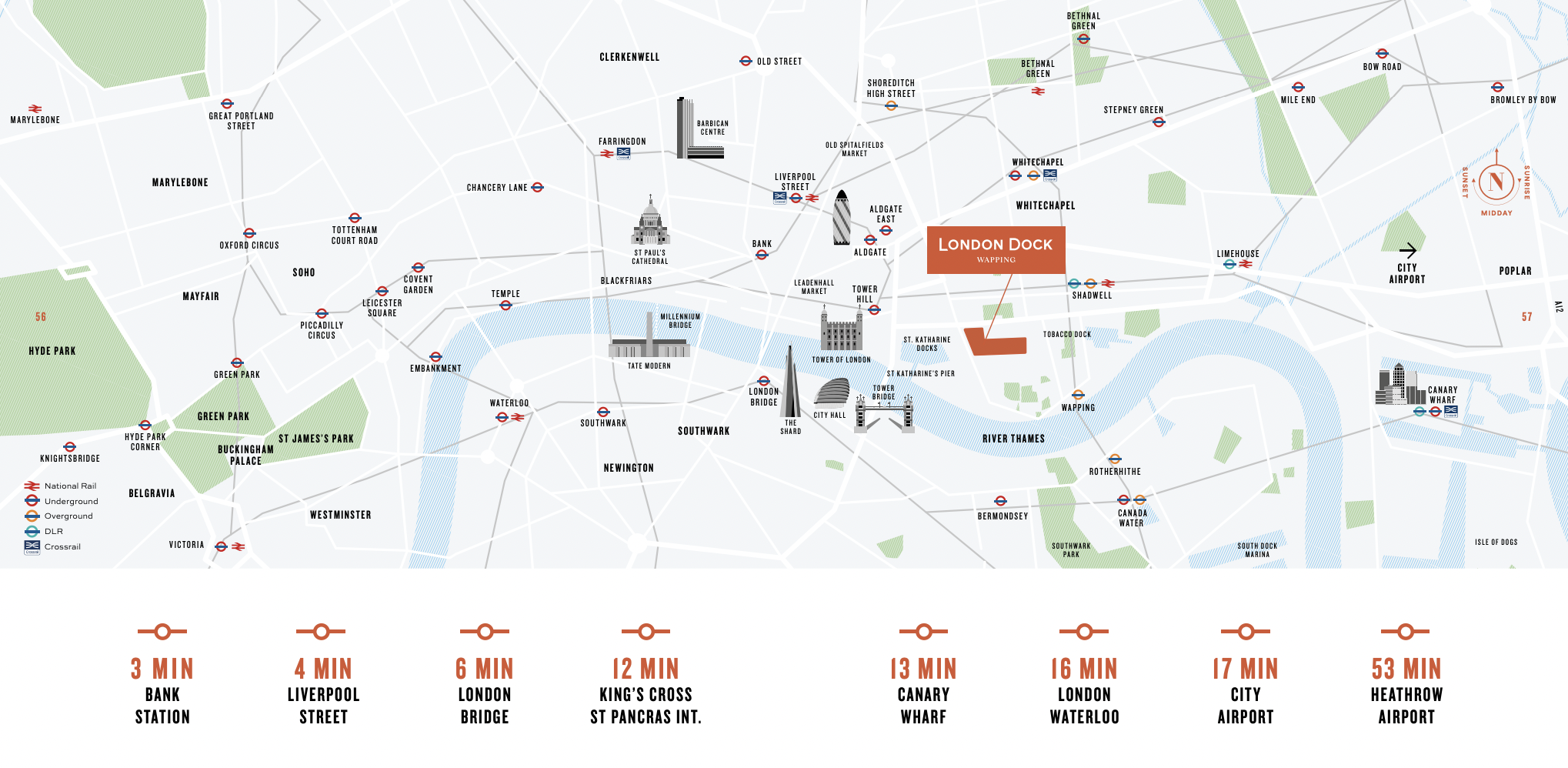 London Dock被现代风格和标志性历史的完美结合所包围,位于首都的中心,距离塔桥、伦敦塔、圣凯瑟琳码头和伦敦市仅一步之遥。London Dock 矗立于Bank 与金丝雀码头中间,完美衔接了新旧两座金融城。在步行范围内有许多伦敦地铁站、码头区轻轨站、地上铁站,提供快速和方便的交通到新旧金融城。 London Dock 提供1,800套全新住宅和180万平方英尺的商业空间,涵盖了商店、酒吧、餐厅和娱乐设施,为伦敦地产市场提供了精美的家园。