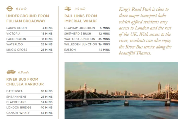 King′s Road Park位于伦敦西南部二区黄金地段,与泰晤士河为邻,步行8-10分钟即可搭乘地铁以及火车,而乘坐地铁约30分钟即可抵达重要交通枢纽国王十字站,可以搭乘欧洲之星直达巴黎、阿姆斯特丹和布鲁赛尔将英国及欧洲其他主要城市紧密连在一起。不仅是路上交通方便,如果您经常出差或是出国旅游,King′s Road Park前往希斯罗机场车程也仅需30分钟。 2021年Crossrail通车之后,King′s Road Park将受益于Crossrail效应大幅缩短通勤时间。 Crossrail铁路是横贯伦敦东西的一条主干线,为英国近二十年来中最大的基础建设,而未来南北向的Crossrail 2 也将设有King′s Road站,不仅能够轻松抵达伦敦各地,周边房价涨幅也非常可观。