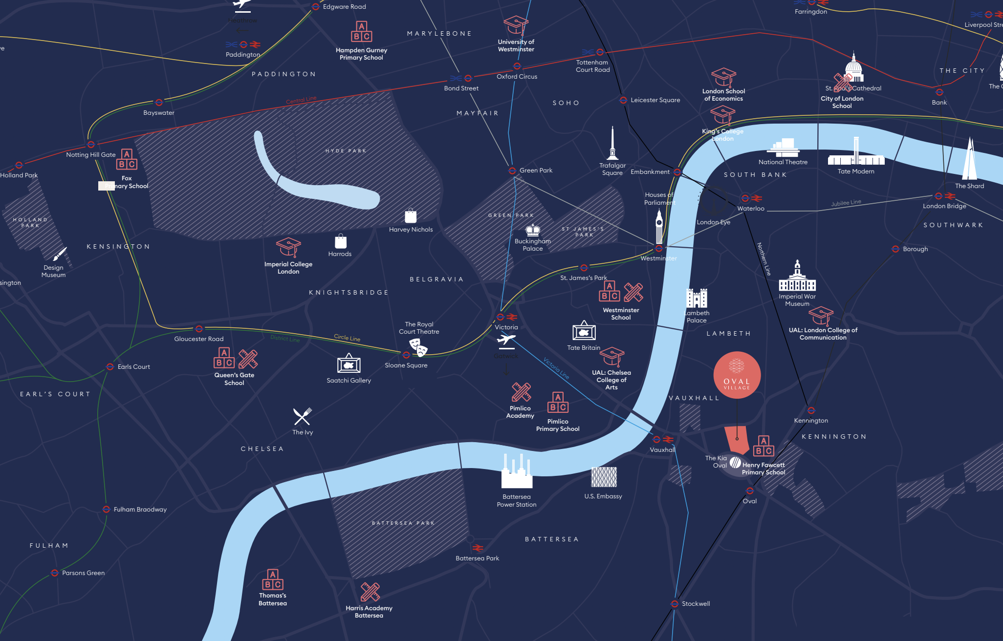 Oval Village地处伦敦一、二区之间,步行十分钟内即可到达三大地铁站,包括Vauxhall、Oval和Kennington站,可以轻松前往伦敦各处,是通勤白领、学生的不二选择。项目步行15分钟可达泰晤士河畔,尽享沿岸风光。