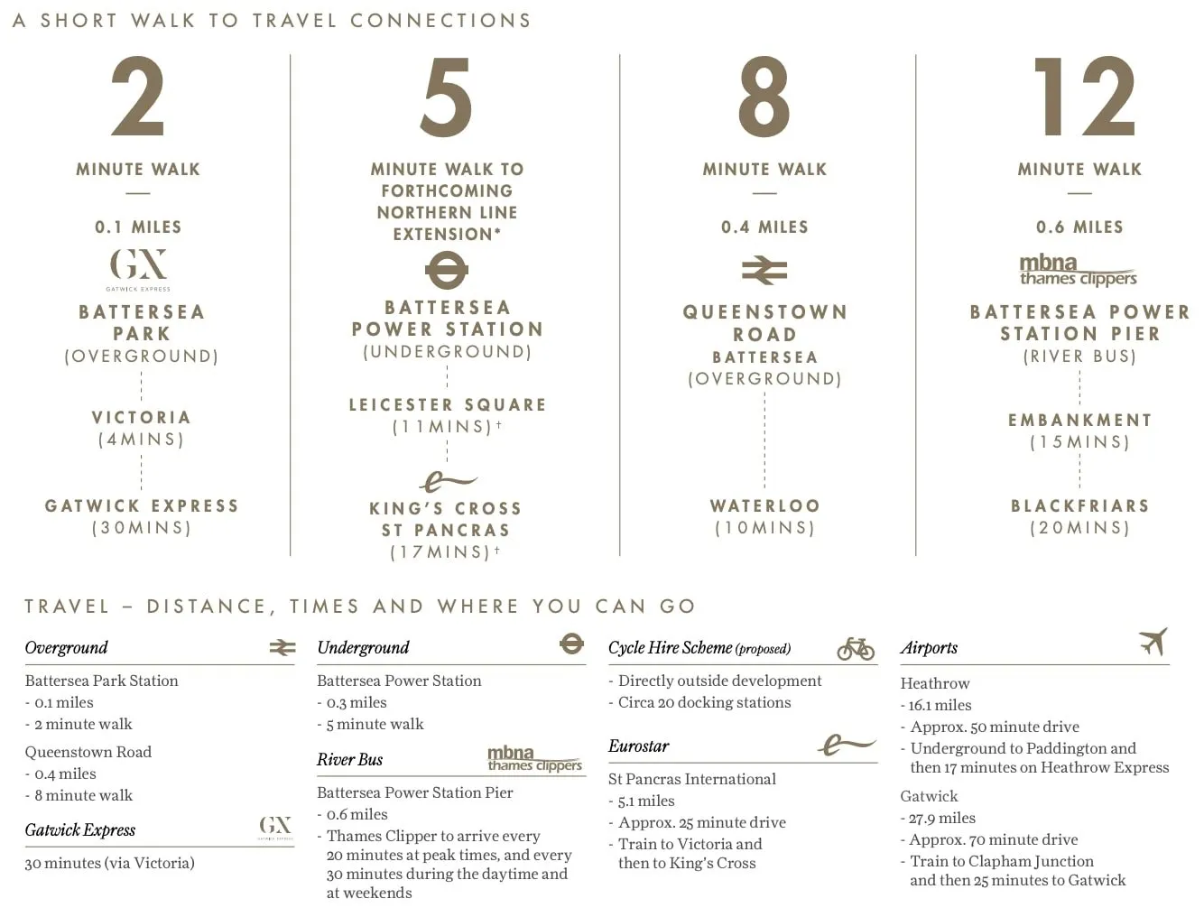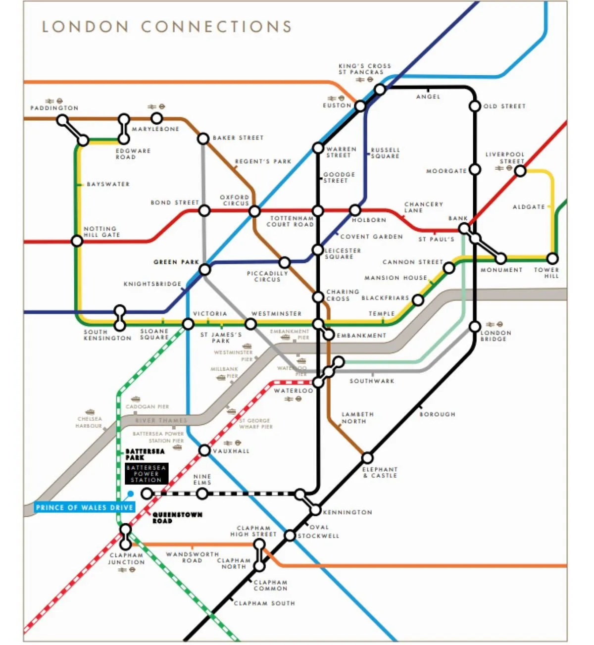 项目坐拥绝佳地理位置和四通八达的交通,只要步行3分钟就可抵达Battersea Park火车站5 分钟至Queens Town Road, 分别可以通往London Victoria (4分钟) 和London Waterloo (5 分钟)。 Prince of Wales Drive步行至新开通的Northern Line延长线地铁站—— Battersea Power 站也只要4分钟,为住户提供更加便捷的交通方式。除了陆上交通外,项目紧邻泰晤士河畔,住户们亦可选择步行6分钟至泰晤士河畔搭乘Thames Clippers 水上巴士,可以通往西敏寺,伦敦桥, 塔桥, 格林威治,金丝雀码头等18个站点。