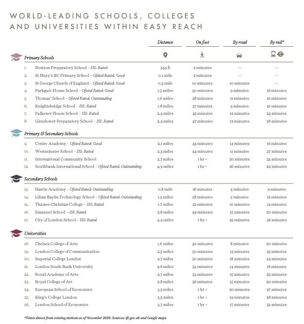 项目周边教育资源丰富,五公里内汇聚了幼稚园、多所小学如Thomas’ School以及诸多优质私校,连乔治王子念的幼儿园也在此区域范围内,九大公学之一的威斯敏斯特公学(Westminster School)也在不远处,可谓坐拥顶尖学区。而Prince of Wales Drive亦得益于其绝佳地理位置,半小时即可通往各所世界著名高校,轻松享受一流教育。