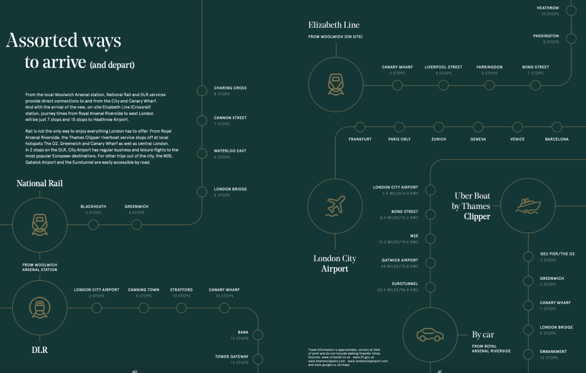 项目享受极为便利的交通条件,海陆空三线交通在此交汇。最新开通的伊丽莎白线把站点Woolwich设在小区里面,7分钟可到金丝雀码头;从项目徒步300米,还可到 Woolwich Arsenal火⻋及DLR轻轨站,DLR两站即达河对岸的伦敦城市机场;小区内也设有Thames Clipper河上巴士站点,可直接乘船前往伦敦市中心。