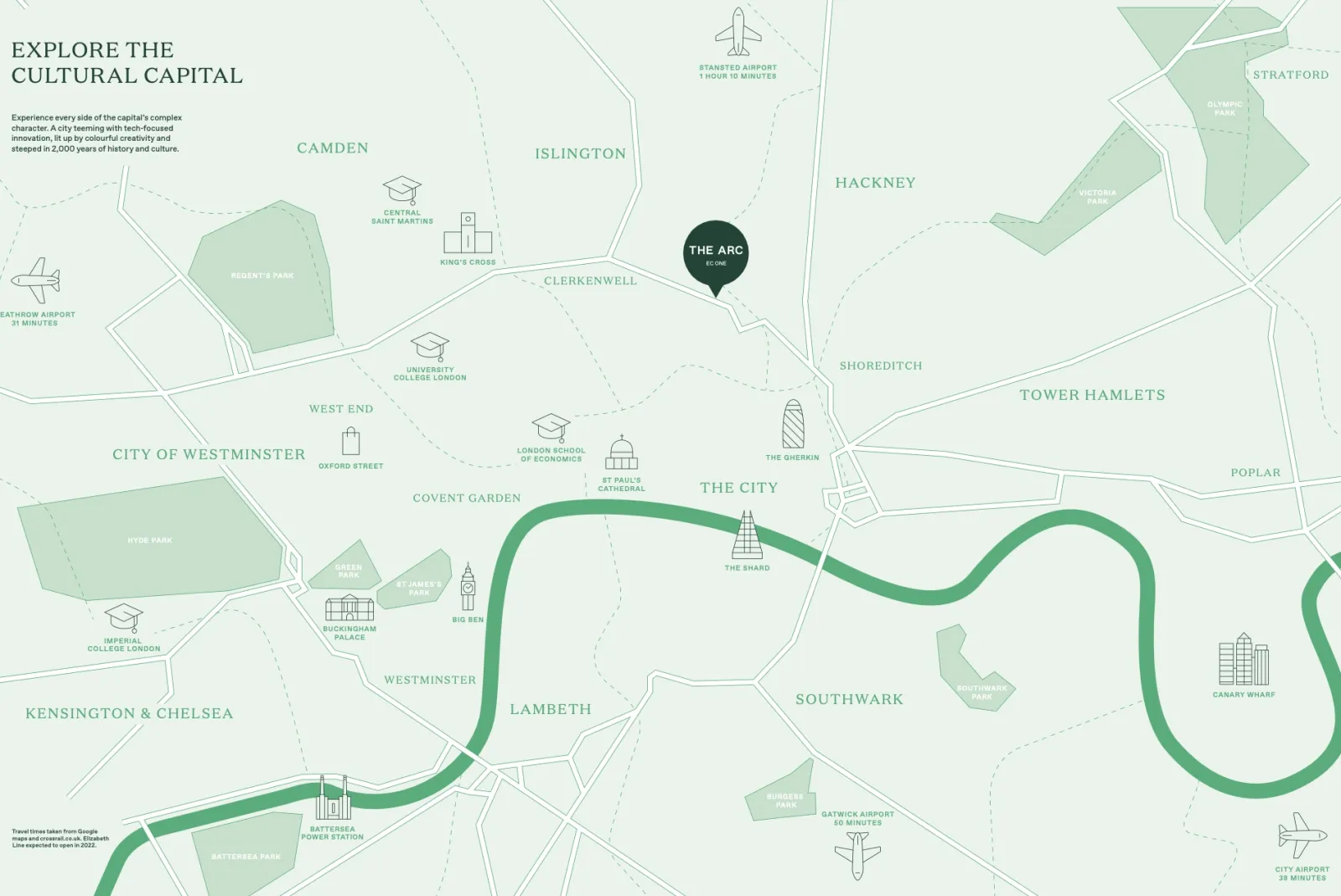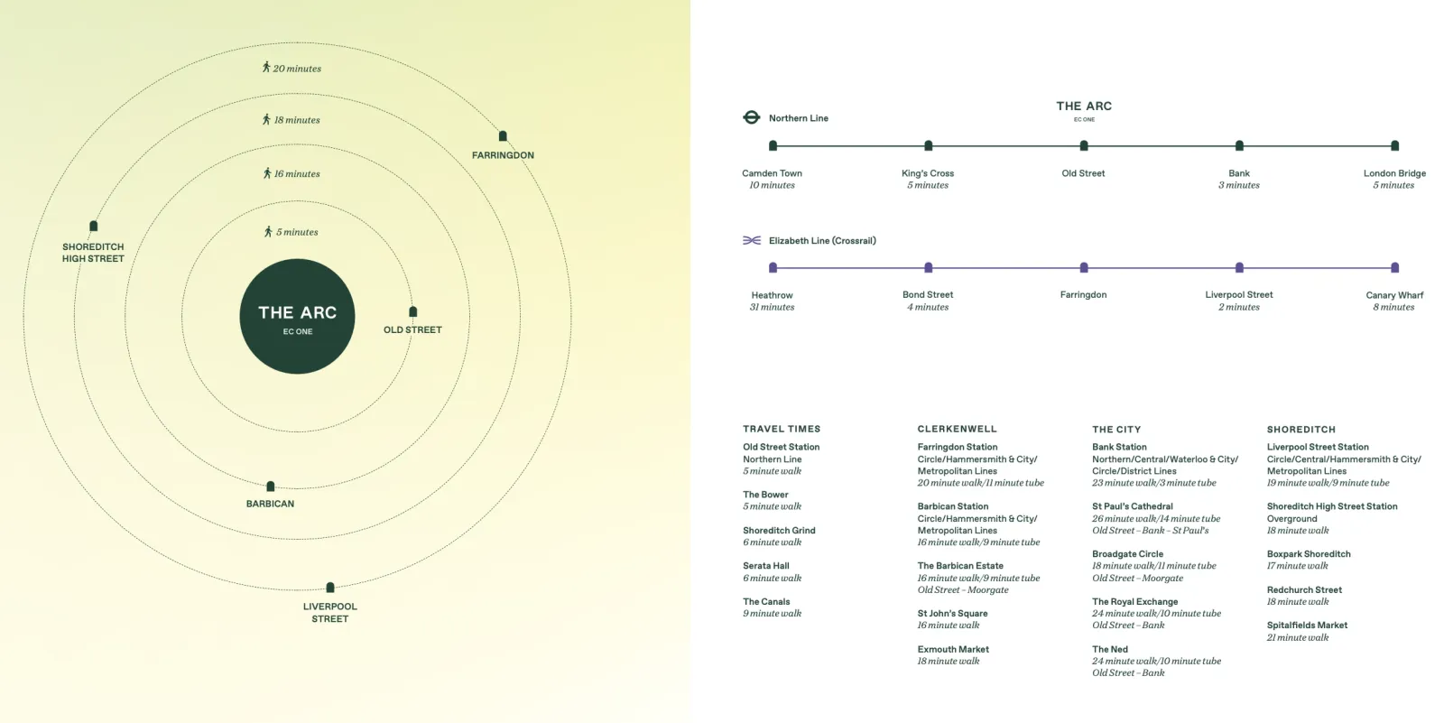 The Arc由英国知名开发商在City Road上首推出的红砖建筑,是一个备受瞩目的伦敦尊尚住宅项目。 22层楼高的The Arc,以其经典及现代艺术启发的工业风格而独具特色,融合了住宅、商业空间、餐厅,提供100个全新开放式、一房至三房的丰富选择,满足不同居住需求,且仅需5分钟步行即可到达Old Street地铁站,3分钟地铁抵达Bank金融区 。