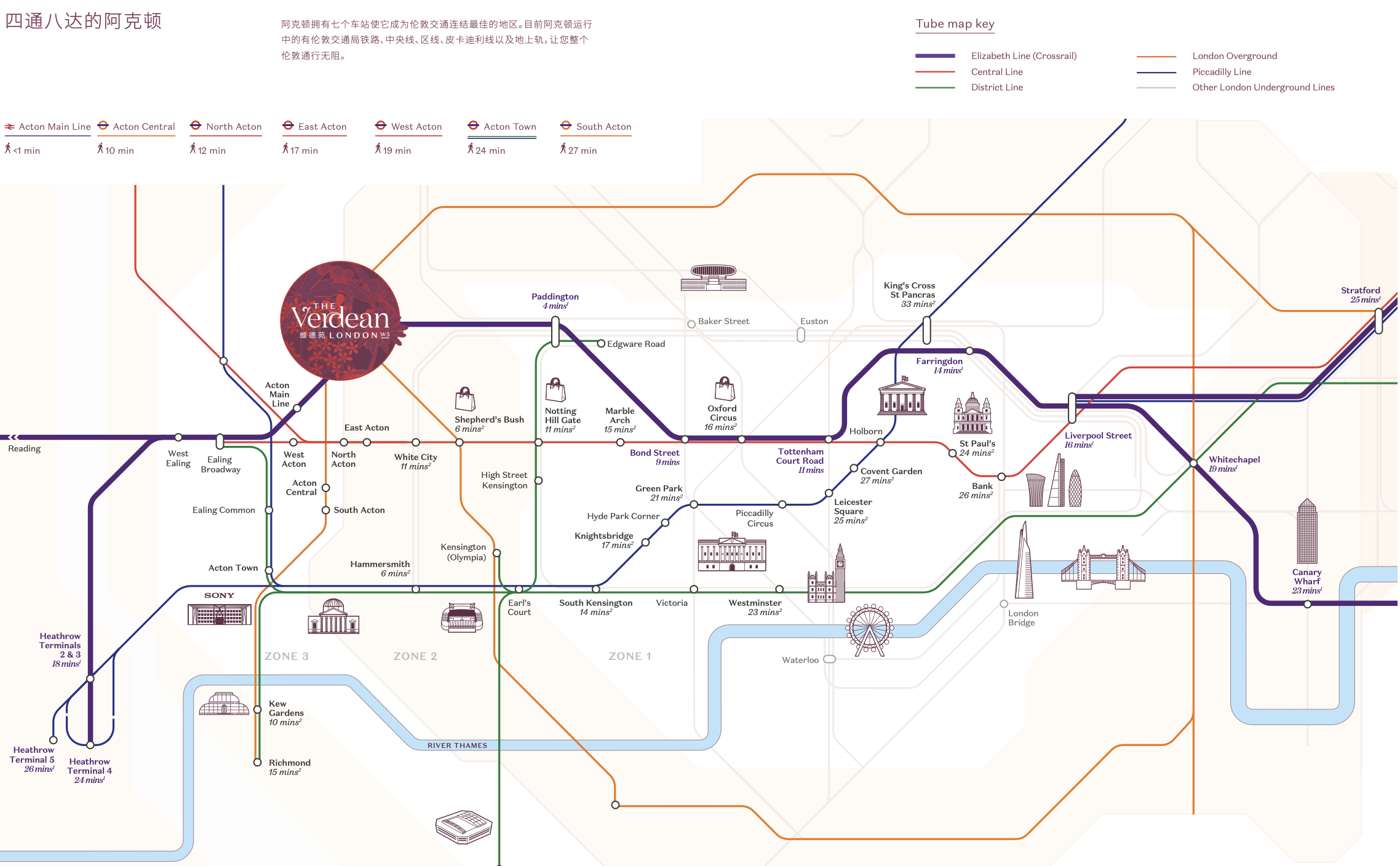阿克顿拥有七个车站使它成为伦敦交通连结最佳的地区。目前阿克顿运行中的有伦敦交通局铁路、中央线、区线、皮卡迪利线、地上轨以及伊丽莎白线,让您整个伦敦通行无阻。乘坐伊丽莎白线仅8分钟即可到达Paddington车站,20分钟直达希思罗机场,30分钟内到金丝雀码头。